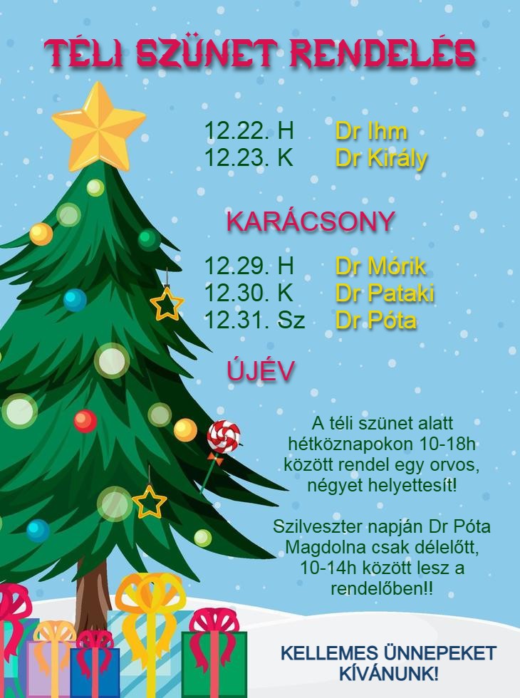 Figyelem! DECEMBER 19-én pénteken  Dr Póta Magdolna és Dr Pataki Erika szabadságon van. Póta drnő helyettese 9-10 h között, Pataki drnő helyettese 10-12 h között lesz elérhető.